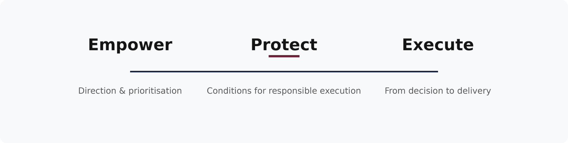 - Execute: Translate leadership decisions into action through clear structure, accountability and organisational momentum.